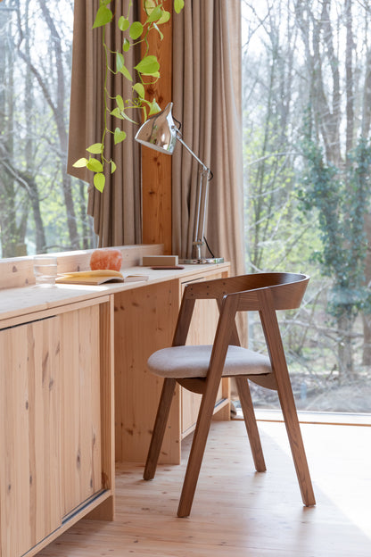 Ar jus taip pat sužavėjo „Mads“? Tai nė kiek nestebina. Šis stilingas baldas lengvai suteikia jaukumo valgomajam. Tvirtos uosio medienos kojos sklandžiai pereina į tobulai išlenktą atlošą. Kartu su sėdimąja dalimi tai užtikrina išskirtinį komfortą. O kaip baigiamasis akcentas – šviesaus audinio ir sodrios riešuto spalvos kontrastas sukuria įspūdingą efektą.