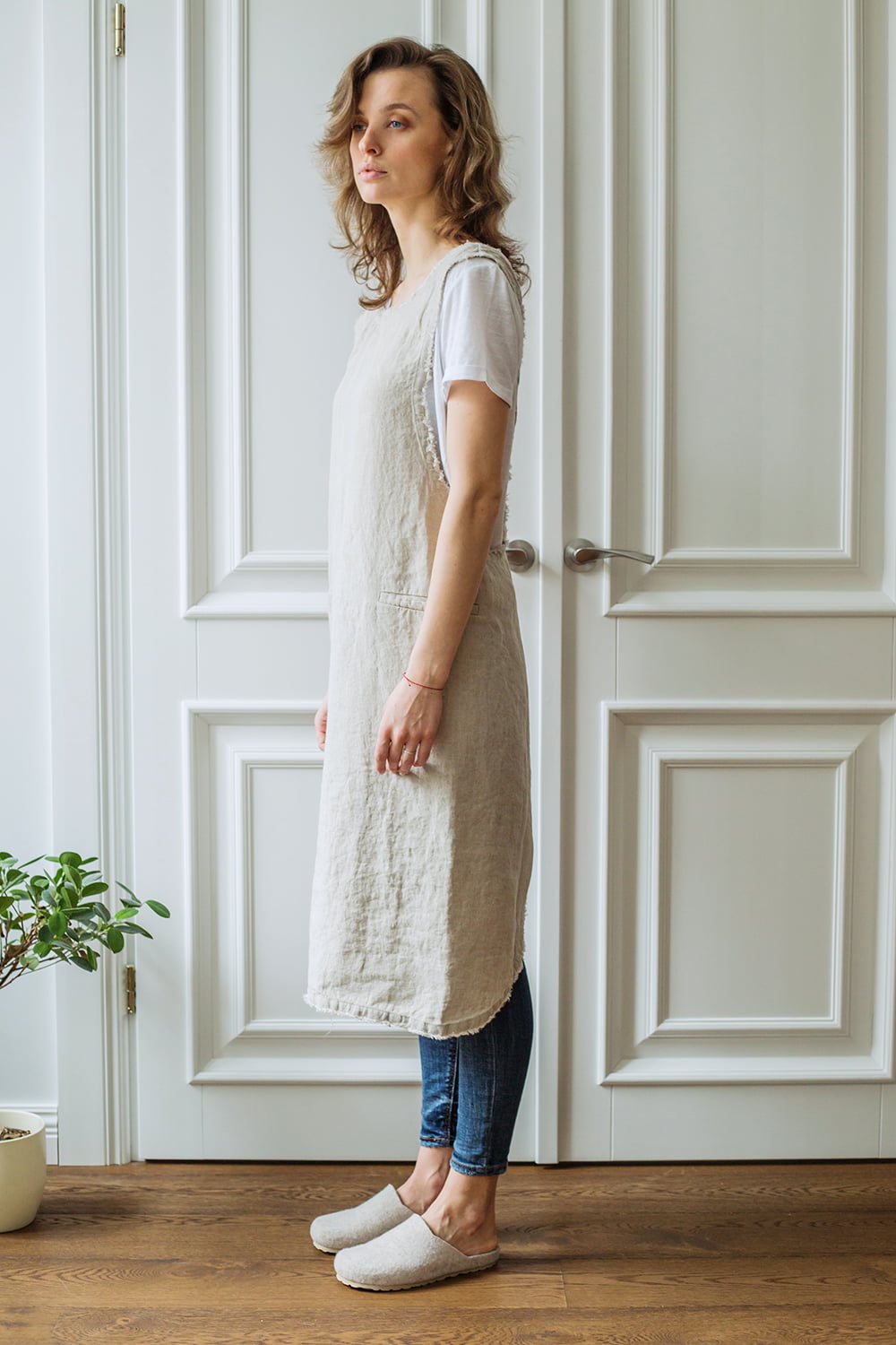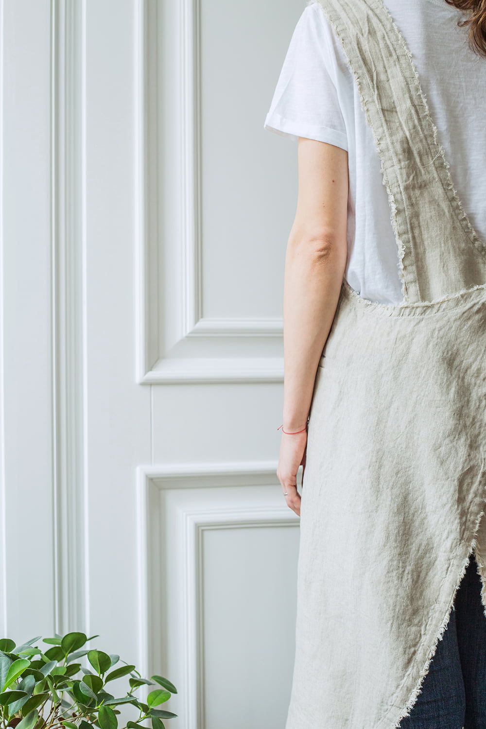 Mūsų prijuostė domum turi sukryžmintas petnešas, todėl jos nereikia užsirišti, o tiesiog užsidėti, kas dirbant priduoda labai daug patogumo. Priekyje yra dvi kišenės, skirtos susidėti naudojamus įrankius, prijuostė pasiūta iš plauto ir minkštinto lino, kuris turi visame pasaulyje pripažintą ir atpažįstamą Oeko Tex Standard 100 sertifikatą. Tai reiškia, kad gaminant šią medžiagą nėra naudojamos jokios kenksmingos medžiagos, o gaminiai iš šios medžiagos saugūs liestis su oda ir yra draugiški aplinkai bei gamtai. Mūsų prijuostės yra skirtos ne tik gaminimui, jas pamėgę ir jau pripažinę floristai, dekoratoriai, sodininkai ir kitų panašių specialybių atstovai.