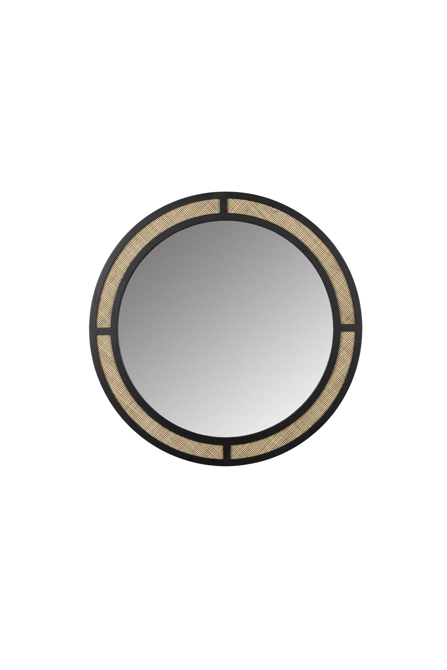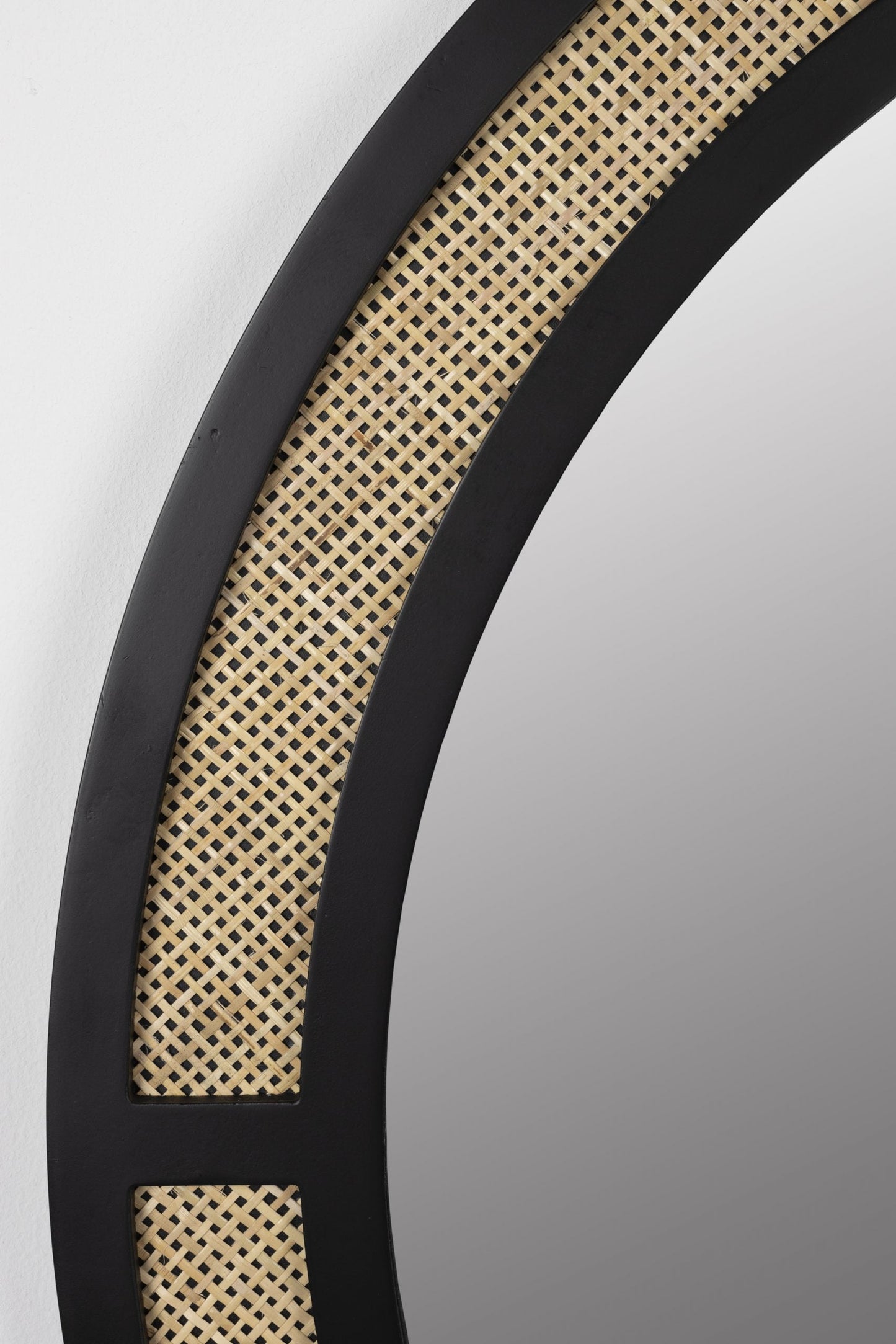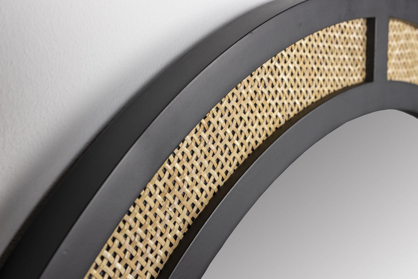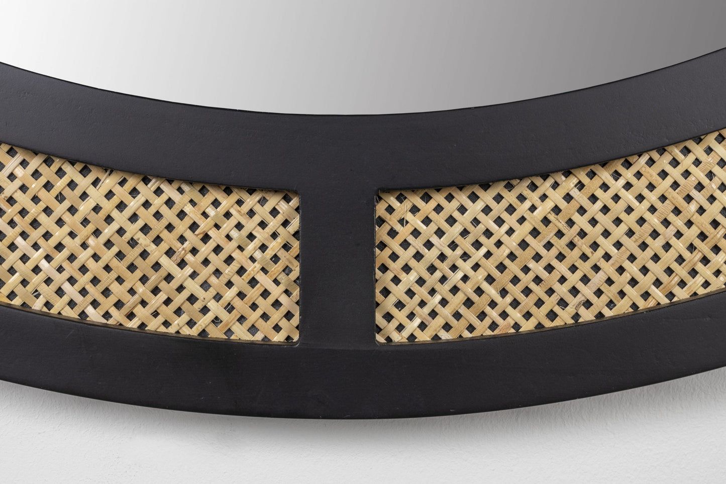 Stiklinis veidrodis su ratano dekoracijomis. Milteliniu būdu dažytas geležinis rėmas.